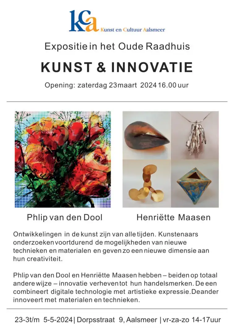 2024, 23 maart tm 12 mei. NB 1 week verlengd. Koningsdag 27 april geopend en zaterdag 11 mei tijdens de Braderie vanaf 12:00 uur. KCA, Oude Raadhuis Dorpsstraat 9, Aalsmeer, Kunst en Innovatie