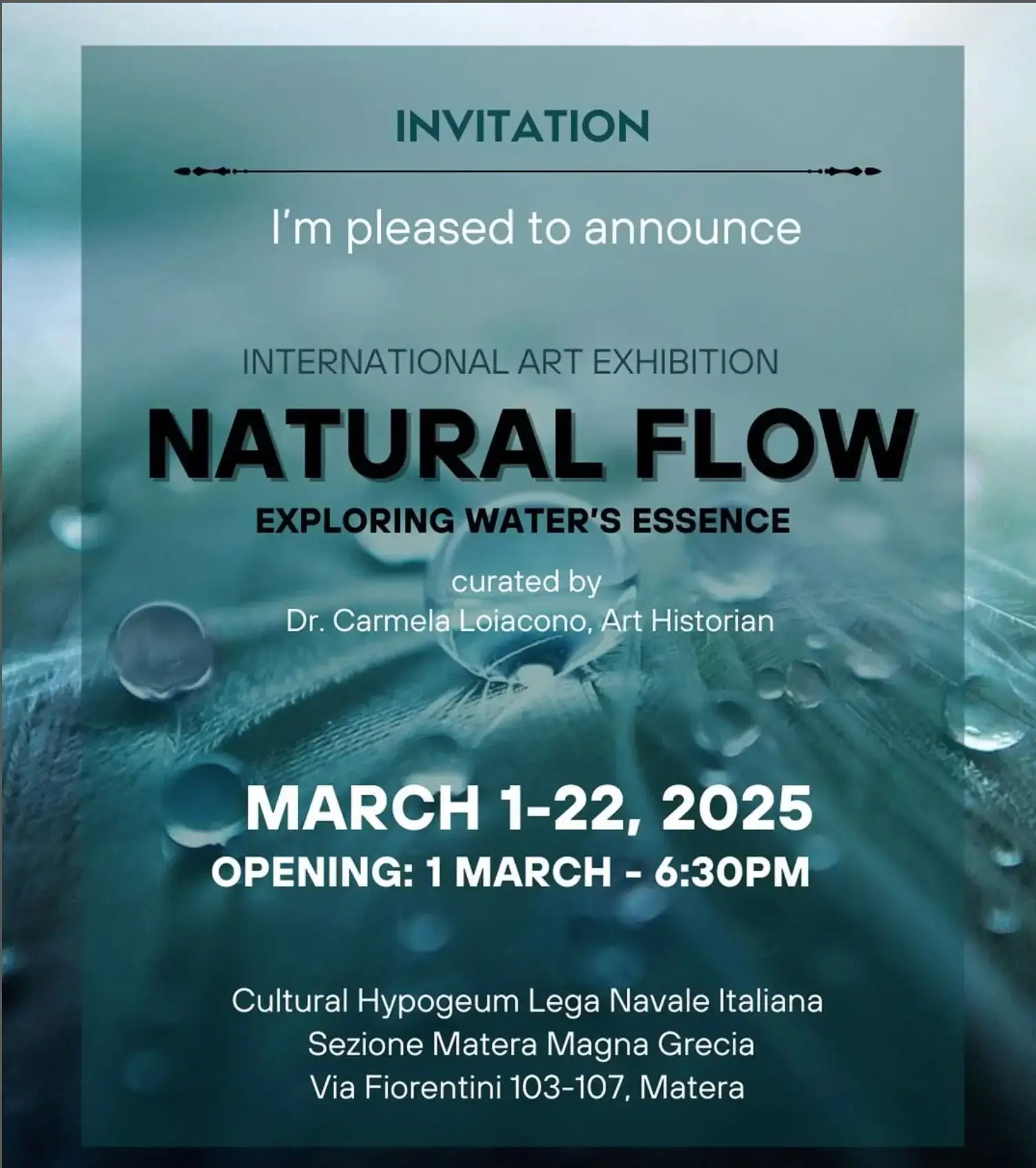 2025, 1-22 maart, Natural Flow, Exploring water’s essense, Matera (It) lega Navale Italiana cultural hypogeum, Art Curator Carmela Loiacono.