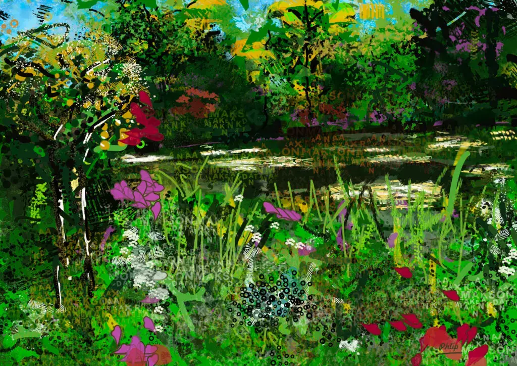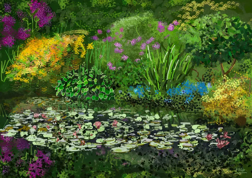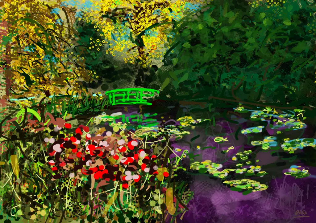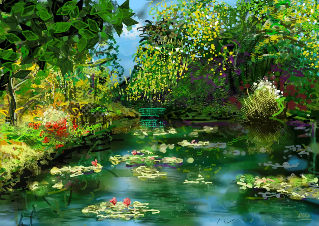 The gardens’ serene beauty inspired a new series of iPad drawings by Philip, aptly titled “Jardin de Monet Giverny.” These works perfectly align with the theme of the “Natural Flow” exhibition in Matera, where four of these pieces, each measuring 30×30 cm, are on display.